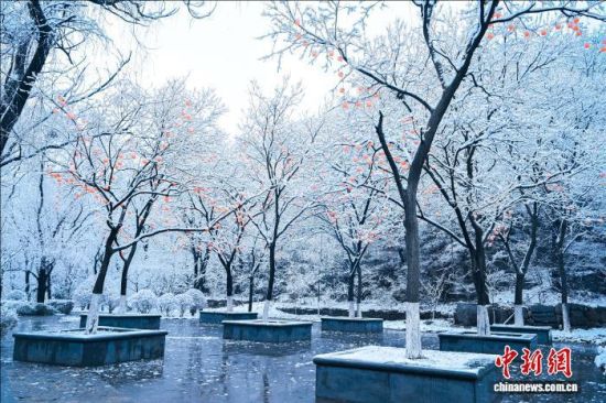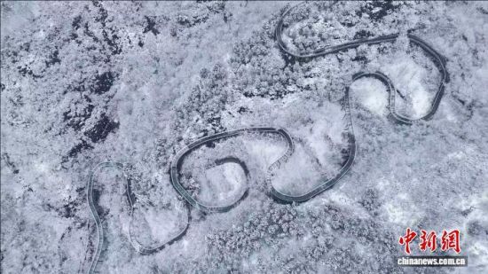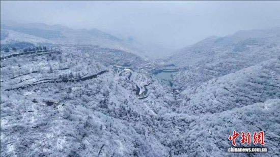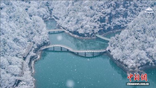 3月2日,山东淄博迎春雪,潭溪山白雪与松枝相映,冰瀑凝成梦幻“琉璃”,从空中俯瞰,宛若水墨画,游客漫步山间如穿行诗画之中。(无人机照片)崔新程 摄