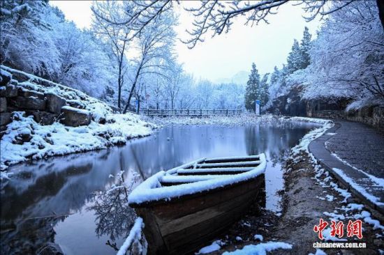 3月2日,潭溪山白雪与松枝相映,木船静默停靠,美若水墨画。 李沅昊 摄