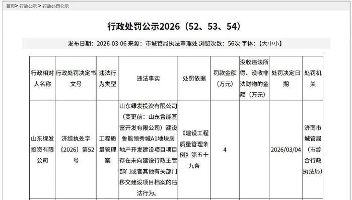 近日,济南市城市管理局官网信息显示,山东绿发投资有限公司受到行政处罚,原因是其开发的济南鲁能领秀城A1地块房地产项目未按规定向建设行政主管部门移交建设项目档案,被该局处以4万元罚款。