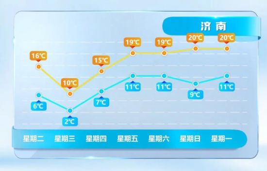 19日夜间到20日白天,全省天气晴间多云。滨州、东营和半岛地区南风短时北风3~4级,其他地区南风3级左右。最低气温:聊城、德州、济南、菏泽、济宁和枣庄4℃左右,半岛内陆地区0℃左右,其他地区2℃左右。最高气温:沿海地区12℃左右,其他地区17℃左右。