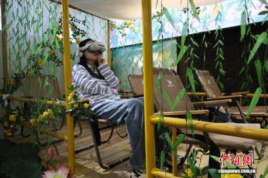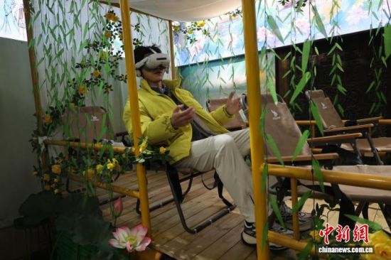3月18日,山东济南,民众佩戴VR眼镜体验《趵突泉VR剧场·如梦令》。当日,济南首个景区定制化沉浸式VR互动体验项目在趵突泉景区启幕。通过VR、AR与实体互动装置,民众可沉浸式体验与李清照一起泛舟湖上、见证辛弃疾的家国情怀,还能参与宋代济南市井的卦签占卜、蹴鞠互动、古法糖人制作等趣味互动。中新社记者 孙婷婷 摄