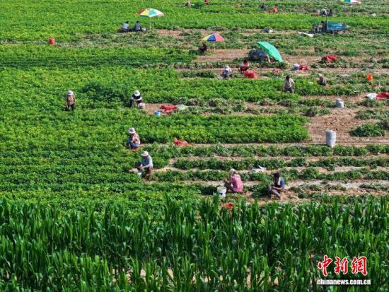 2025年8月14日,农民在山东省聊城市茌平区杨官屯乡杨北新村采收花生。马红坤 摄