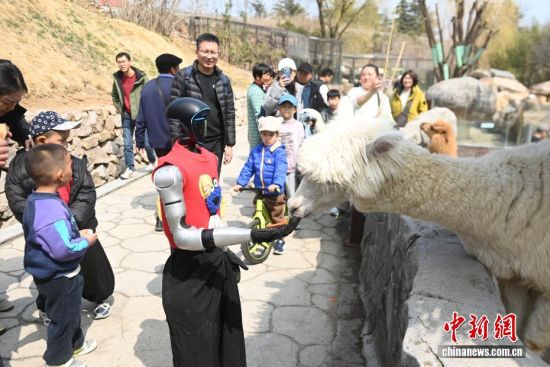 3月21日,位于青岛西海岸新区的青岛森林野生动物世界春风和煦,智能机器人、机器狗亮相巡游队伍,与舞蹈演员、杂技演员及各类动物一同前行,吸引大量游客驻足互动。今年清明节假期,该园将推出“AI青野·萌趣潮玩季”春季主题活动,其间每日都将举行AI机甲萌兽巡游。图为机器人投喂动物,吸引大量游客驻足观看。俞方平 摄