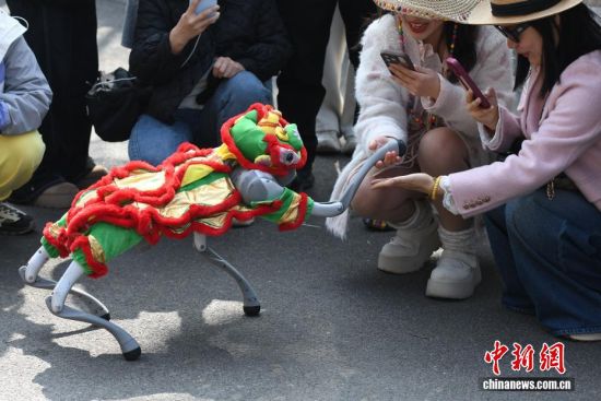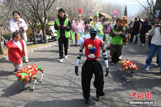 3月21日,位于青岛西海岸新区的青岛森林野生动物世界春风和煦,智能机器人、机器狗亮相巡游队伍,与舞蹈演员、杂技演员及各类动物一同前行,吸引大量游客驻足互动。今年清明节假期,该园将推出“AI青野·萌趣潮玩季”春季主题活动,其间每日都将举行AI机甲萌兽巡游。图为机器狗与游客互动。俞方平 摄