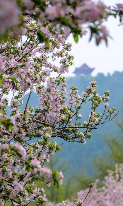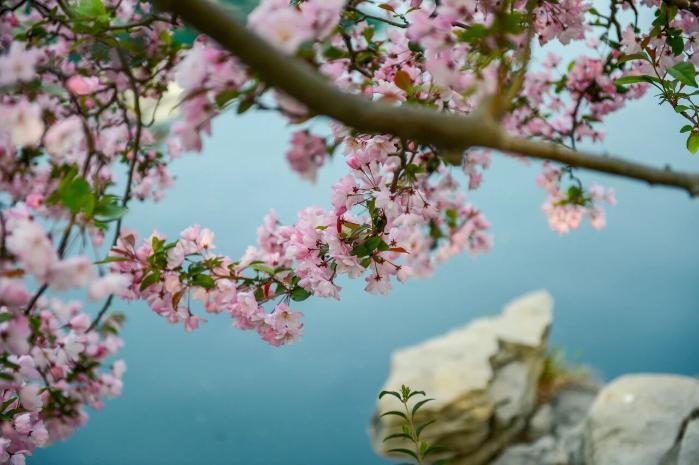 五龙潭的海棠虽不繁密,却株株开得热烈。潭边漫步,海棠倩影映在碧波中,微风拂过花枝轻颤,暗香浮动。东南角为赏棠佳处,透过花枝望向潭西名士阁,碧潭、楼阁与繁花相映,诗意盎然。