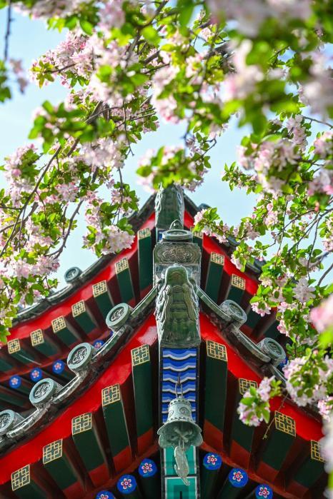 踏入山东古建筑博物馆(万字会旧址),雕梁画栋藏着岁月底蕴,海棠便是这份厚重里最灵动的点缀。红墙碧瓦间,粉白花枝探出院檐,风过花瓣轻落,古建的庄严与海棠的柔美相融,随手一拍皆是古风佳作。