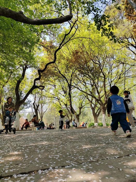 微风轻拂,樱瓣簌簌飘落,铺就一条浪漫的“花径”,落英缤纷间,游人或在花树下闲坐,静听泉水叮咚,悠然自得;或举着相机定格美好瞬间,拍照打卡的人群络绎不绝。