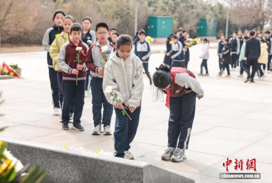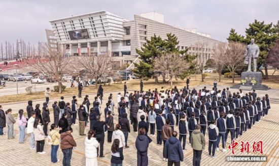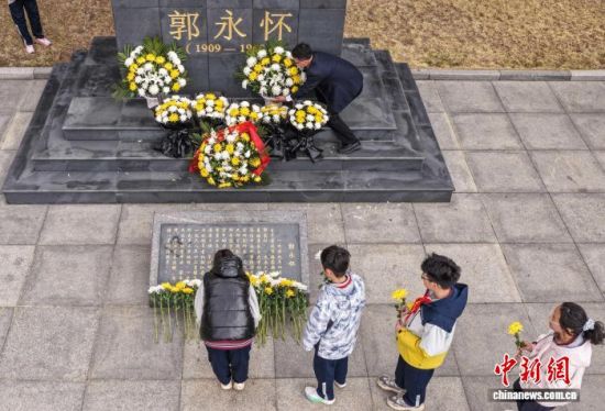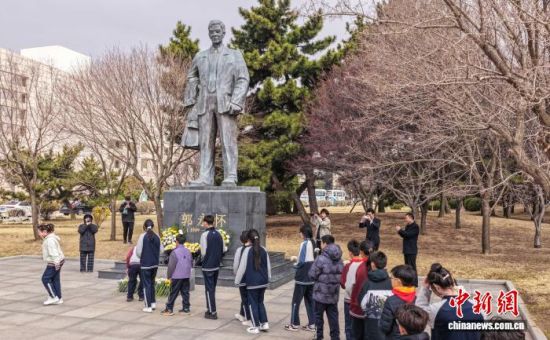 4月4日,山东荣成,郭永怀事迹陈列馆前,社会各界代表向郭永怀雕像敬献鲜花,并肃立默哀。当日是“两弹一星”元勋郭永怀诞辰117周年。中新社发 李信君 摄