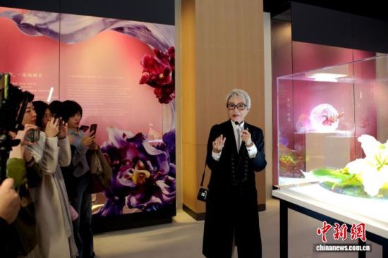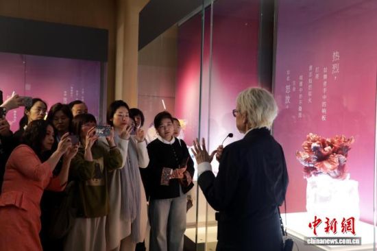 图为台湾女演员、琉璃工房创始人、琉璃艺术家杨惠姗在展览现场介绍“一朵中国琉璃花”单元的作品。 李欣 摄