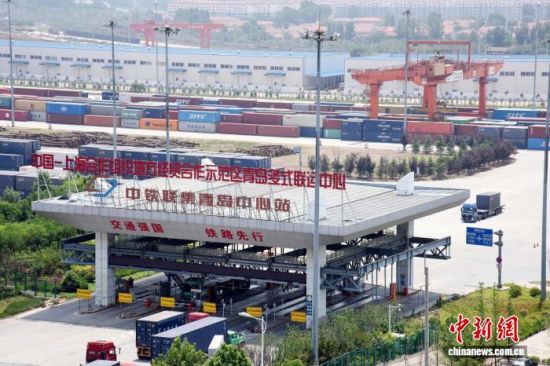 资料图:上合示范区青岛多式联运中心内一派繁忙景象。(无人机照片)上合示范区管委会供图