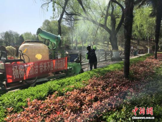 图为河南漯河绿化工人对杨柳树喷淋抑制飞絮。宋陟睿 摄