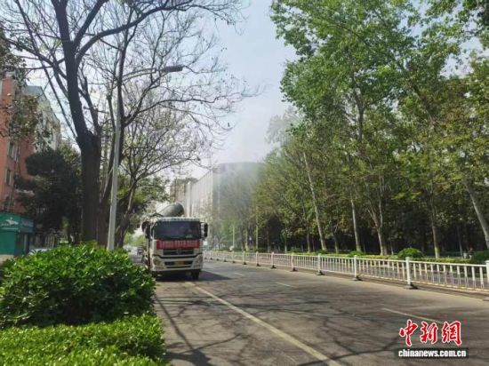 图为河南漯河雾炮车驶上街头喷雾增湿抑絮飘。宋陟睿 摄