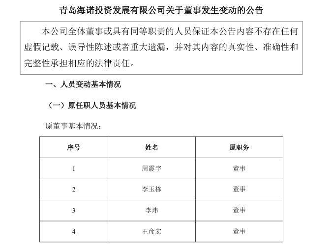 近日,青岛海诺投资发展有限公司(下称“海诺投资”)发布《关于董事发生变动的公告》,披露公司董事会完成新一轮调整。