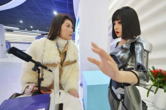 参会人员在体验家庭健康管理机器人。王海滨 摄