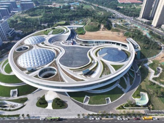 该项目位于青岛市崂山区,建筑面积10.4万平方米,定位为新型产业用地,是青岛市虚拟现实产业园综合配套区的核心项目。整体设计以“平行世界”为理念,通过建筑与自然山体的有机融合,打破虚实边界。建筑外观采用梦幻飞碟造型,屋面综合运用景观水池、太阳能光伏、种植屋面、覆土坡地及钢结构ETFE膜等工艺,融入中国传统“五行”元素,形成独特的“五行天眼”视觉效果。