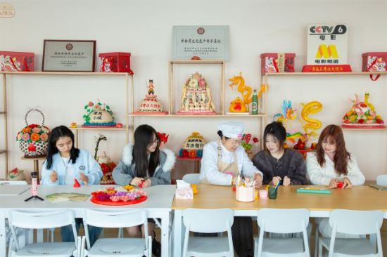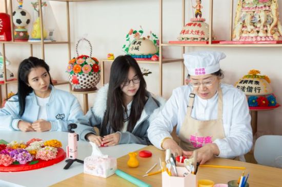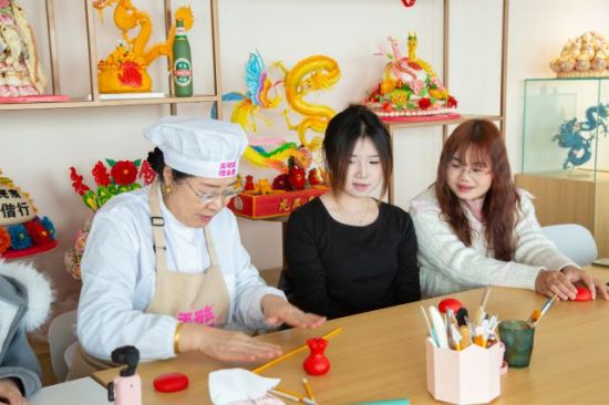 外国友人在传承人指导下体验面塑技艺。谢顺伟 摄