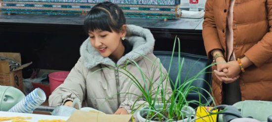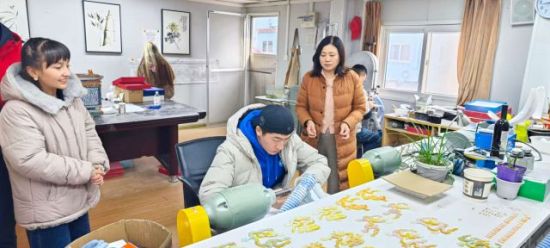 外国友人跟随工艺老师学习贝雕工艺品的制作技巧。谢顺伟 摄