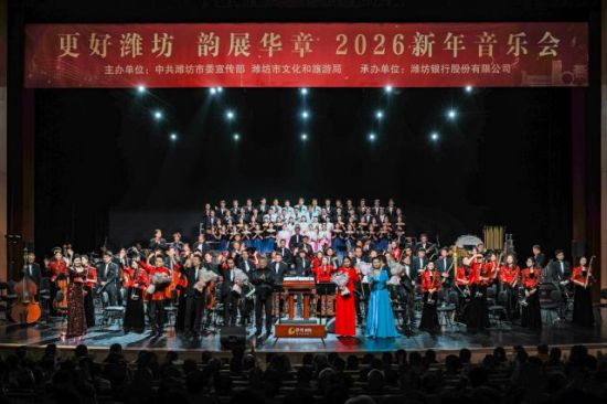 中新网山东新闻12月29日电 “更好潍坊·韵展华章”2026新年音乐会日前在潍坊大剧院落幕。这场潍坊银行承办的国乐盛宴,以14首经典曲目和3次返场表演,串联起传统与现代的对话,为1400余名市民与各界英才献上了一场震撼心灵的艺术盛宴。