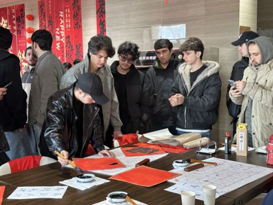 迎新年,品非遗。现场,包饺子、剪纸、制作螺钿等特色非遗体验区前围满了外籍留学生,大家踊跃体验着不同的非遗活动。剪纸体验区,留学生们手拿一把剪刀,一张红纸,手指翻飞间,“福”“囍”等代表着吉祥寓意的图样跃然纸上;书法体验区,大家执笔挥毫书写着对未来的“福”愿,感受中国笔墨的独特神韵;茶艺体验区,大家则体验了中国传统茶艺,于一呼一吸间感悟东方哲学的宁静与雅致。
