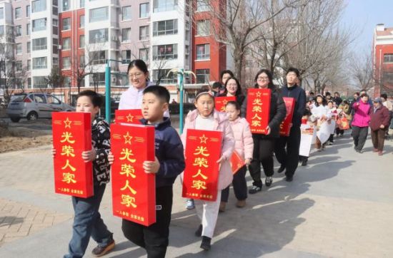 中新网山东新闻2月14日电(张孝鹏 宗绪昌 张志国)临近春节,青岛市平度市凤台街道幸福里社区东潘家疃网格村格外热闹,锣鼓声响彻整个村庄,8名少年儿童每人手里捧着一盏写有“光荣人家”的“光荣灯”走在前面,村干部、村民代表、小学生一起敲锣打鼓,带着福字、花生油、大米、酒等慰问品,敲锣打鼓,来到8户军属家中,为他们挂“光荣灯”,送上全村人的温暖和祝福,以感谢他们对祖国国防事业作出的贡献。