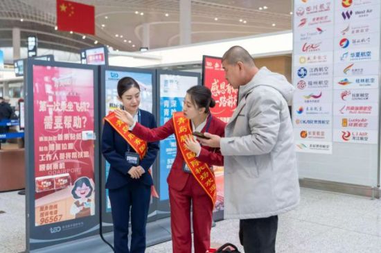 针对老弱病残孕等特殊旅客,青年志愿者们启动专项帮扶机制,提供“一对一”全流程护航。从入口搀扶、行李协助,到优先值机、安检引导,再到候机陪伴、登机衔接,每一个环节都细致周到,用暖心陪伴让空港服务更有温度、更具质感。