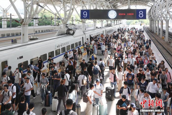 10月8日,江苏南京,旅客们在火车站出行。当日是国庆中秋假期最后一天,长三角铁路迎来返程客流最高峰。中新社记者 泱波 摄