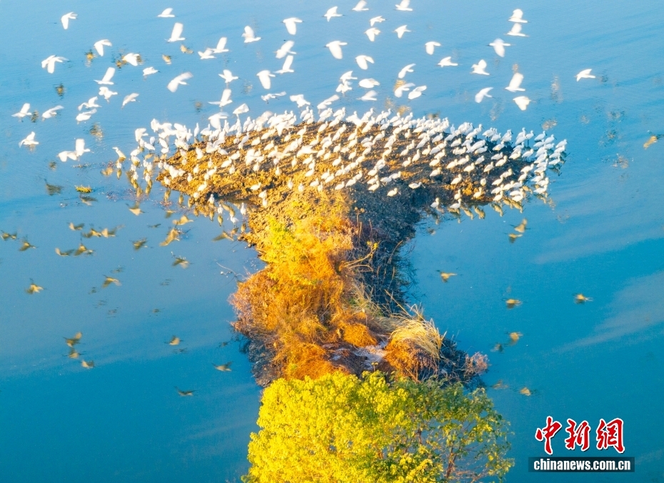 江苏兴化:候鸟飞抵湿地公园 浅滩觅食休憩