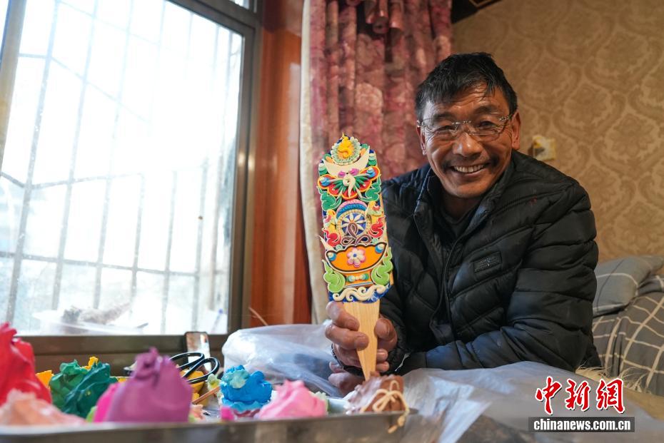 2月4日,随着藏历新年临近,拉萨街头年味渐浓,年货市场上的“孜扎”迎来热销。酥油花藏语称“孜扎”,是藏族民众家中必备的年货。图为手工艺人展示制作完成的酥油花。贡确 摄