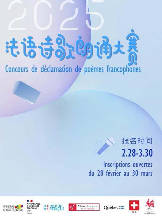 在第29届法语活动月的框架下,中国法语联盟携手法国文化中心、瑞士驻华大使馆、魁北克驻华代表处和比利时瓦隆-布鲁塞尔国际关系署,荣幸地向您宣布:2025年第四届法语诗歌朗诵大赛即将开启!