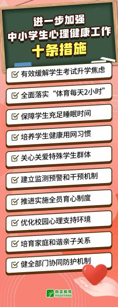 中新网10月24日电 据“微言教育”微信公众号消息,近日,教育部印发通知,出台《进一步加强中小学生心理健康工作十条措施》。具体内容如下: