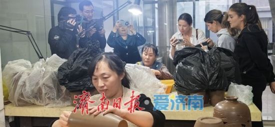 章丘这片土地是闻名遐迩的“龙山文化”发祥地,不仅孕育了黑陶文明,更以“千年古县”的底蕴和“百脉泉”为核心的明水古城,承载了济南作为“泉城”的灵秀之源与历史之根。活动首日,英国博主团队抵达中国龙山文化黑陶研发中心刘德功黑陶艺术馆,进行了实地探访与制作拍摄。他们近距离欣赏了中国黑陶工艺美术大师、中国黑陶非物质文化遗产传承人刘德功先生的黑陶作品,精致的器型、流畅的线条和黑釉的光泽,让他们深深感叹中华文明的传统美学与匠心工艺。随后英国博主们走进德功黑陶非遗工坊,了解龙山文化的历史源流与地域特色。并在艺术家胡新苗的讲解下,亲手体验了黑陶拉坯、雕刻等黑陶制作工艺流程。“黑陶的薄胎与镂空技艺令人惊叹!”Kerry在拍摄间隙感叹,能够亲手制作有着数千年历史的黑陶,这种体验可以近距离地感受到中国文化的温度与生命力,这种文化传承令人敬佩。