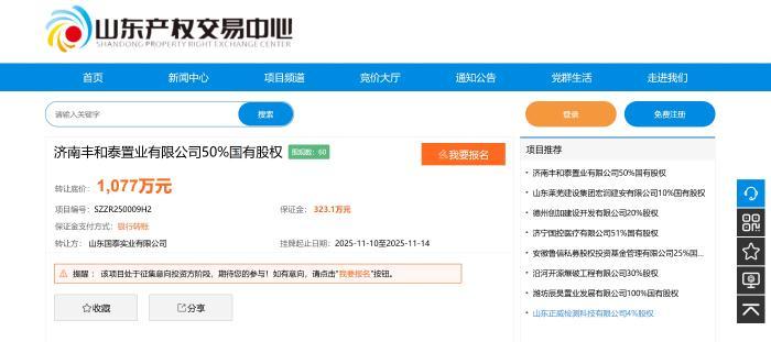 今日,山东国泰实业有限公司(下称“国泰实业”)通过山东产权交易中心,挂牌转让济南丰和泰置业有限公司(下称“丰和泰置业”)50%国有股权,转让底价1077万元,保证金323.1万元,挂牌起止日期为2025年11月10日至2025年11月14日。
