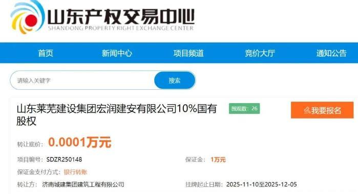 11月10日,济南城建集团建筑工程有限公司以1元底价在山东产权交易中心挂牌转让山东莱芜建设集团宏润建安有限公司(下称“宏润建安”)10%国有股权。