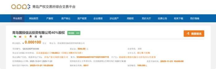 10月下旬,青岛产权交易所一则股权转让公告引发市场关注:青岛国投信远投资有限公司(下称“国投信远”)40%股权以1元底价挂牌转让,竞价开始时间为11月21日。