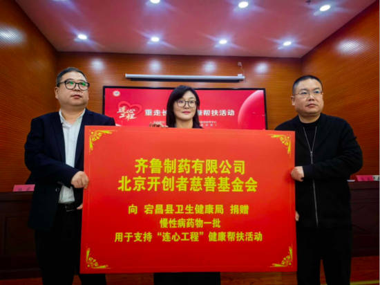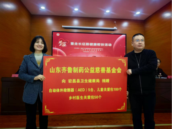 仪式上,山东齐鲁制药公益慈善基金会、齐鲁制药有限公司等爱心企业分别向宕昌县卫生健康局捐赠体外除颤器(AED)、儿童关爱包、乡村医生关爱包以及慢性病药物等物资,用于支持“连心工程”健康帮扶活动,表达对基层健康守护者的敬意与关怀。