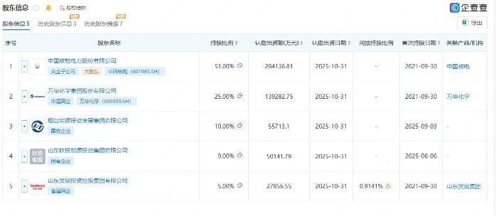 股权穿透显示,中国核电、万华化学(600309.SH)、烟台能源投资发展集团、山东铁投能源投资集团、山东发展投资控股集团分别持股51%、25%、10%、9%、5%。