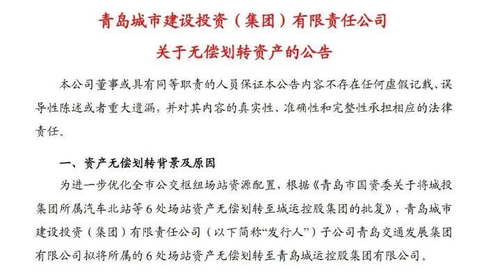 11月17日,青岛城市建设投资(集团)有限责任公司(下称“青岛城投集团”)发布无偿划转资产的公告。