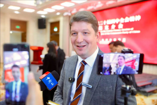 2025年11月17日,二十届四中全会精神专题宣介会在北京举办,来自美国、英国、欧盟、瑞士、日本、新加坡、俄罗斯、中东欧、拉美、非洲等30多个国家和地区的160多位外国代表出席。图为俄罗斯中国友好协会副主席谢尔盖·沙罗诺夫接受记者访问。中新社记者 易海菲 摄