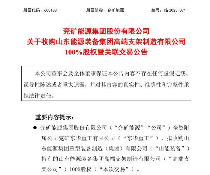 11月27日,兖矿能源集团股份有限公司(简称“兖矿能源”)发布公告,全资附属公司兖矿东华重工有限公司(简称“东华重工”)以34484.74万元,收购山东能源集团重型装备制造(集团)有限公司(简称“山能装备”)持有的山东能源装备集团高端支架制造有限公司(简称“高端支架公司”)100%股权。