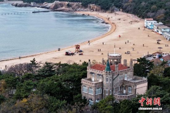 12月2日,山东青岛,红瓦洋房被彩叶环绕,澄澈的碧海与蔚蓝天空相接,红瓦、彩叶、碧海、老街相映成趣,勾勒出青岛兼具自然灵秀与人文底蕴的初冬画卷。(无人机照片)梁犇 摄