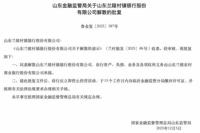 近日,国家金融监督管理总局山东监管局发布了6则关于村镇银行解散的批复公告,获批解散的银行包括兰陵村镇银行、禹城胶东村镇银行、夏津胶东村镇银行、威海富民村镇银行、临淄汇金村镇银行、邹平浦发村镇银行。批复时间均为12月5日。