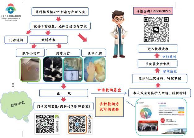 先心病患儿该怎样就诊呢?山东大学附属儿童医院(济南市儿童医院)心脏外科医生为家长朋友们细心准备了就诊治疗流程导图。