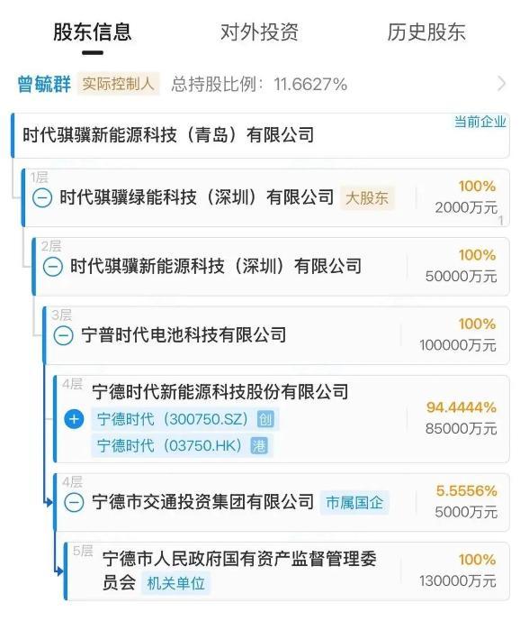 股权穿透显示,该公司由宁德时代旗下时代骐骥新能源科技(青岛)有限公司全资持股,最终实控人为宁德时代董事长兼总经理曾毓群。