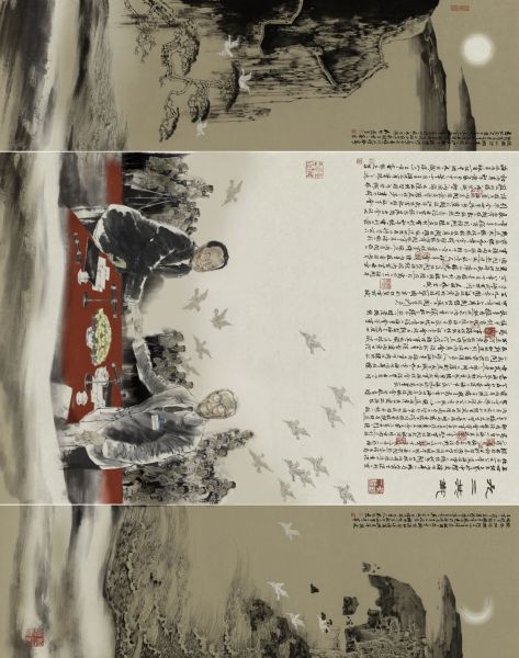 其一,在笔墨语言的探索上,实现了从技法到美学的系统性突破。专家认为,该组画在画面构成上,展现出驾驭“大构成”与“大概括”的卓越能力,使宏大叙事与精微细节浑然一体。其独特的“线条性写实”路径,既吸纳西画造型之严谨,又深植于中国画以线立骨的书写传统,精准表现了历史人物的精神气质与时代风貌,形成鲜明的个人符号。作品体现了艺术家对儒家文化“尽善尽美”审美境界的追求,以及“文”与“质”平衡关系的处理。在整体意境上笔墨苍润并济,墨色层次丰富,在深沉的历史感中保持了写意精神的鲜活气韵,并成功运用光影等现代视觉元素,增强了画面的史诗感与表现力。