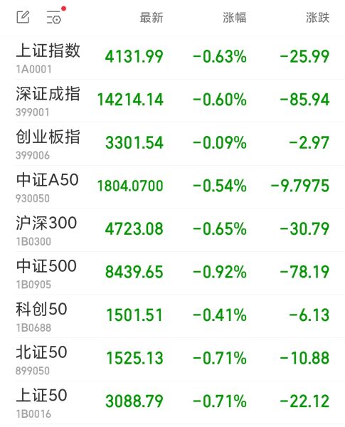 中新经纬1月30日电 周五,A股三大指数集体低开。上证指数跌0.63%,报4131.99点;深证成指跌0.60%,报14214.14点;创业板指跌0.09%,报3301.54点。