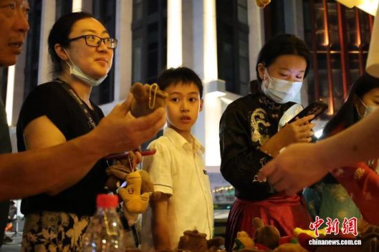 济南市民在“国潮中医馆”摊位购买中药材玩偶。周艺伟 摄