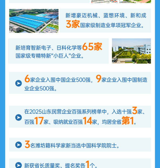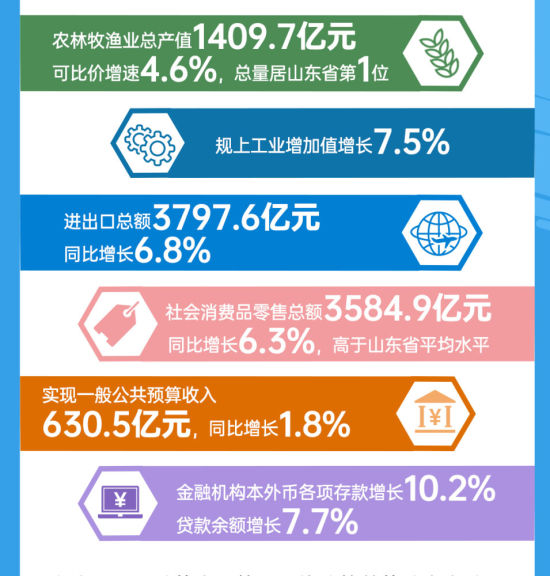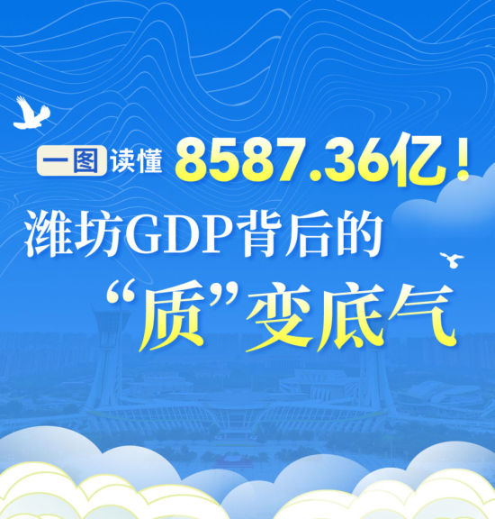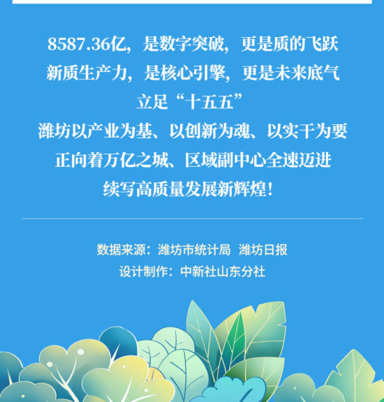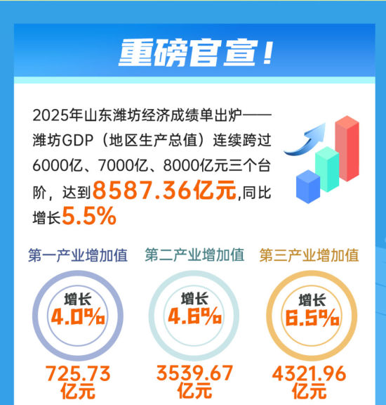 中新网山东新闻2月4日电(沈广安)2月3日,2025年山东潍坊经济“成绩单”出炉。潍坊GDP(地区生产总值)连续跨过6000亿、7000亿、8000亿元三个台阶,达到8587.36亿元,同比增长5.5%。其中,规模以上工业增加值同比增长7.5%;金融机构本外币各项存款、贷款余额分别增长10.2%和7.7%;居民人均可支配收入45794元,同比增长4.6%。下面,一图读懂潍坊8587.36亿GDP背后的“质”变底气。