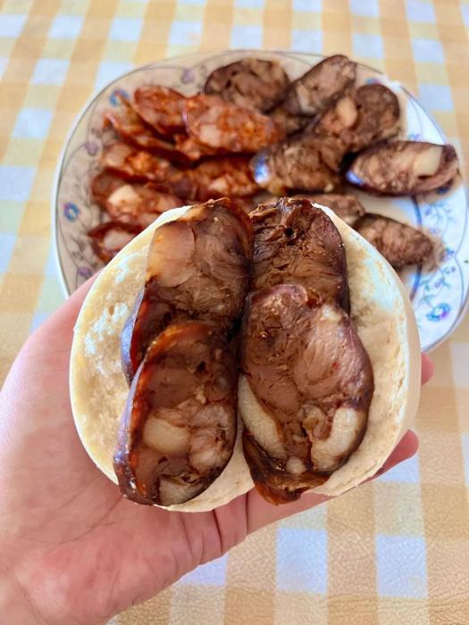吃法上,山东人更偏爱蒸着吃,这样最能锁住原汁原味。蒸好的香肠切片,红白相间,油脂透亮,掰开刚出锅的大馒头,夹上几片,肉粒在嘴里爆开,不柴不腻,越嚼越香,缺点就是太费馒头。