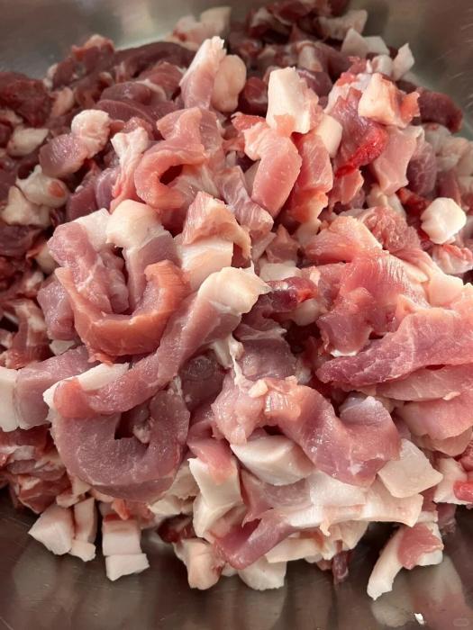 “三分肥七分瘦,灌出的香肠香又透。”灌香肠的肉首选前腿肉或后腿肉,多以手工切丁为主,为的是保留肉粒带来的扎实口感。