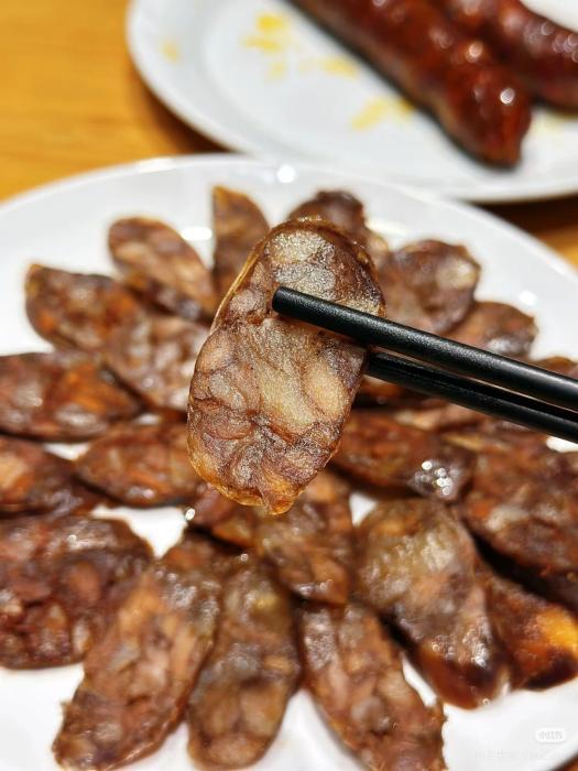 等盐分慢慢渗透,香肠表面泛起淡淡白霜,捏起来外硬内软,便是可以享用的时候了。
